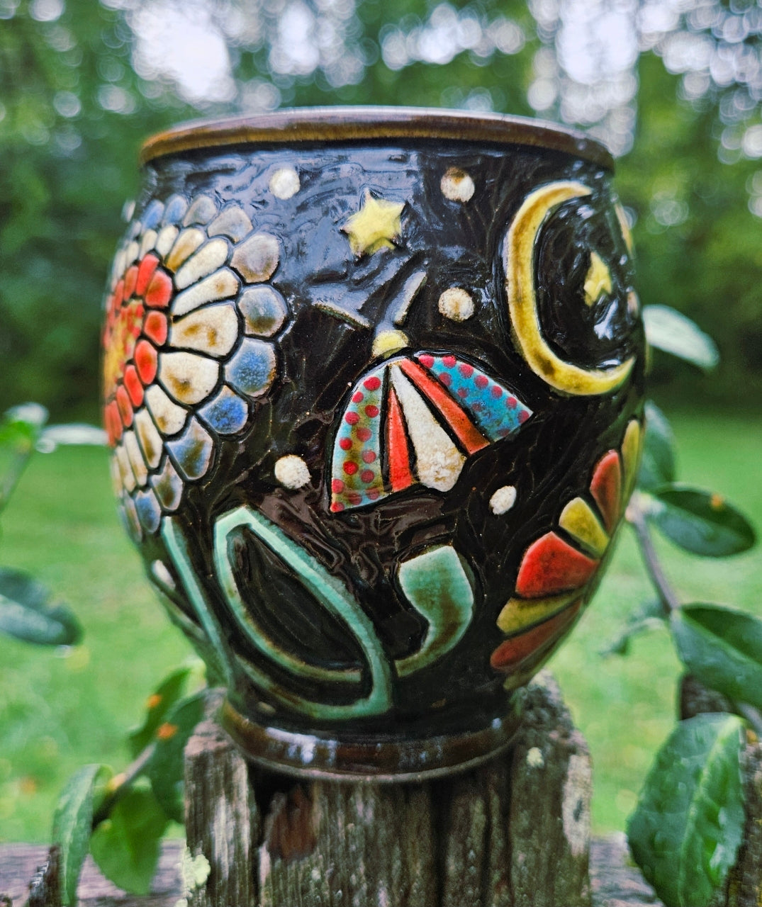 This Ceramic Wine Cup was hand thrown, carved and painted. It features it's own unique flower and color pattern with a bolt and mushrooms. It measures approximately 4 inches tall and 3 1/2 inches wide and will hold approximately 8 fluid oz.