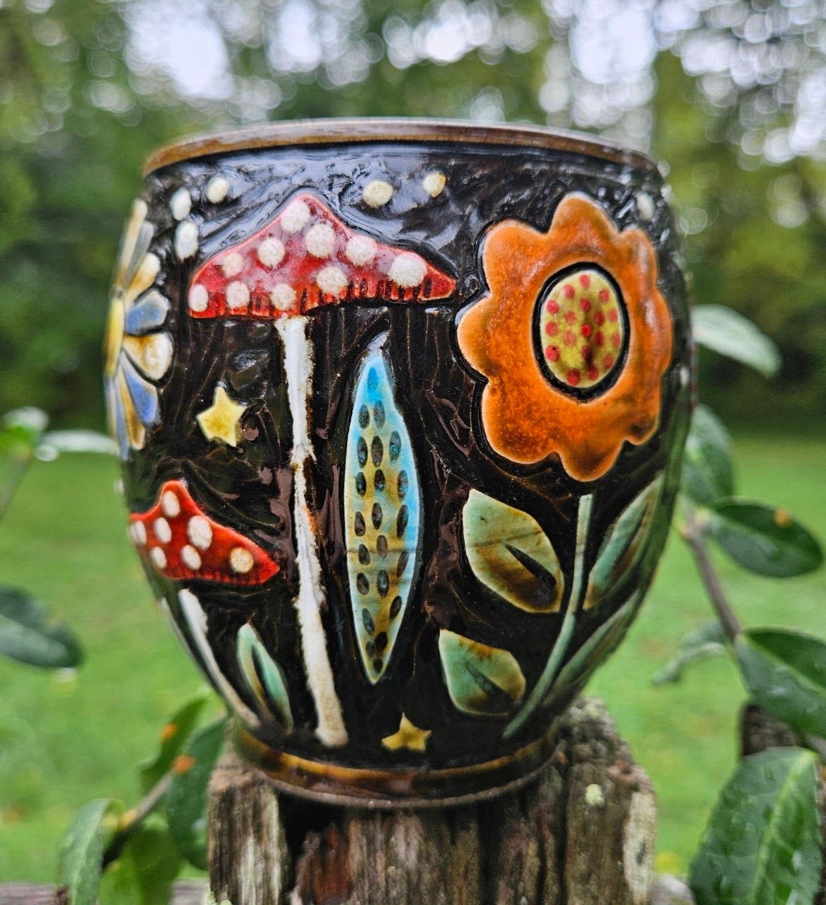 This Ceramic Wine Cup was hand thrown, carved and painted. It features it's own unique flower and color pattern a fish, donuts and mushrooms. It measures approximately 4 inches tall and 3 1/2 inches wide and will hold approximately 8 fluid oz.