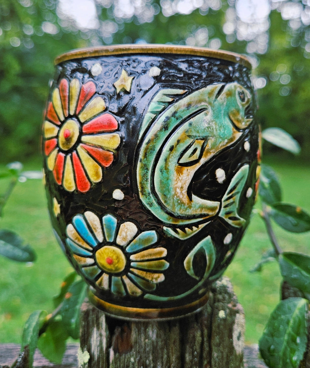 This Ceramic Wine Cup was hand thrown, carved and painted. It features it's own unique flower and color pattern with a bolt and trout design. It measures approximately 4 inches tall and 3 inches wide and will hold approximately 8 fluid oz.