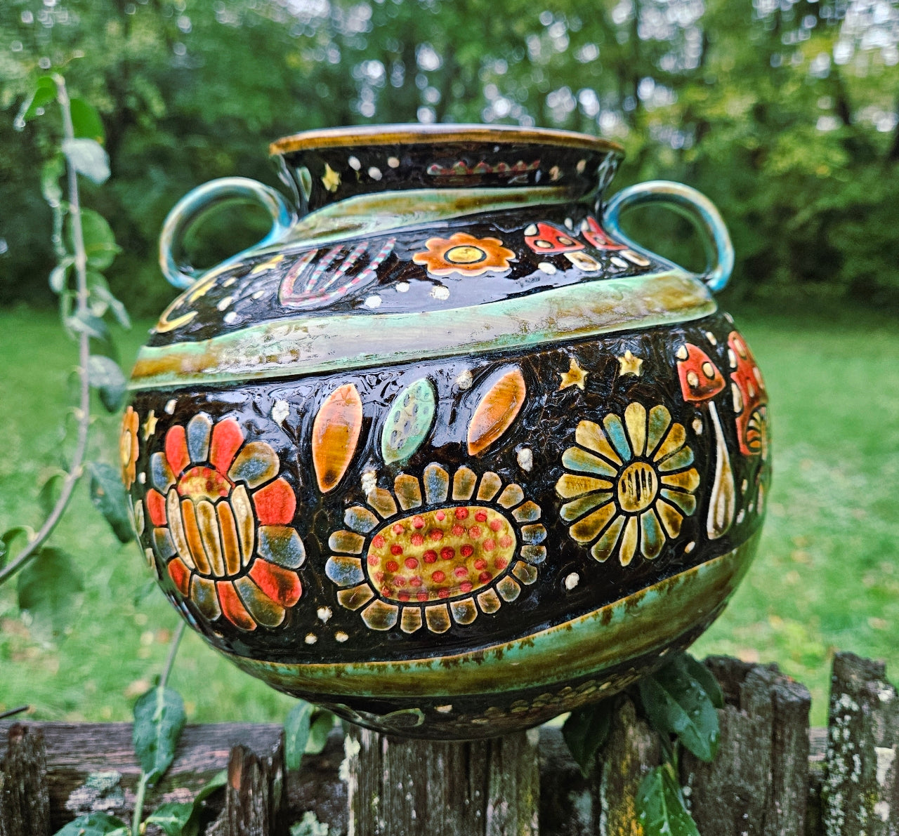 This hand thrown, carved, and painted stoneware vase is decorated with a moth and nature scene. It was finished with a translucent amber glaze. All pieces are food, microwave and dishwasher safe. Approximately 8 inches tall and 8 inches.